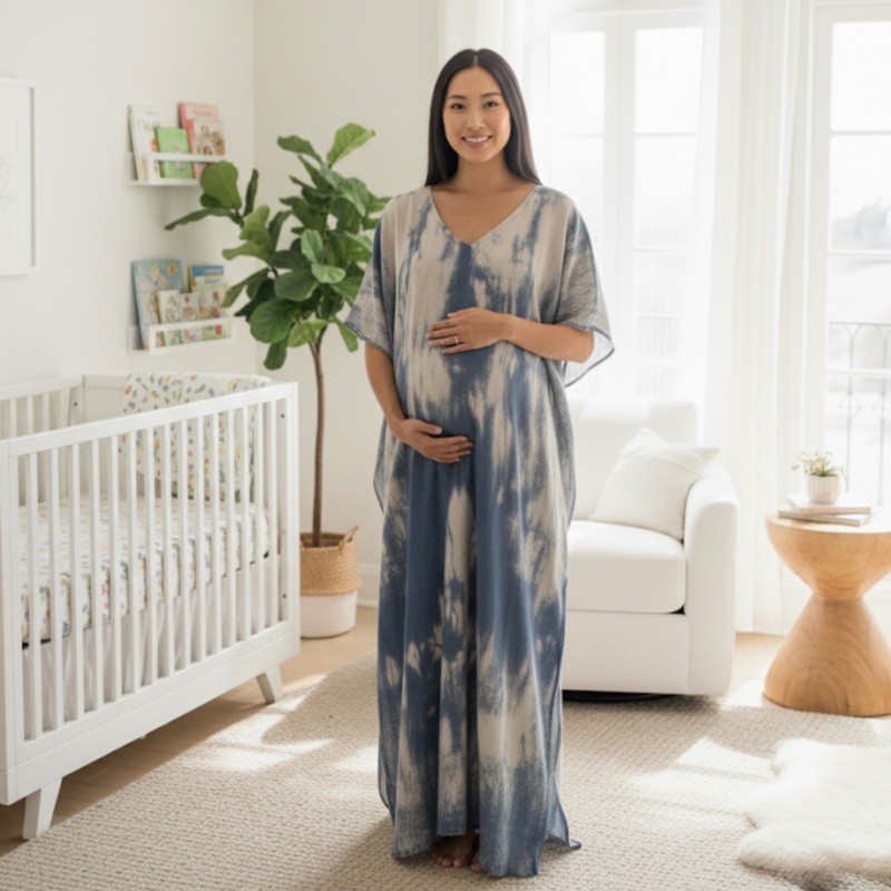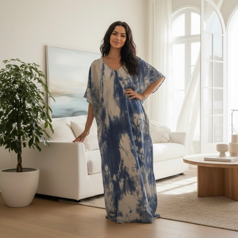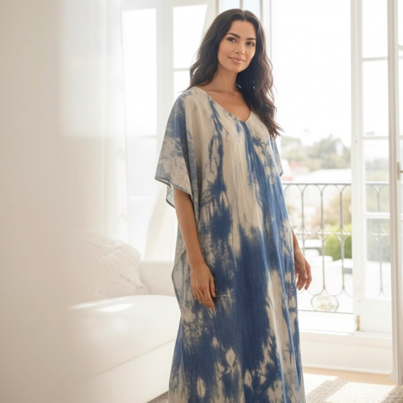 This luxury silk kaftan dress is made from 100% lightweight silk and features a flowy oversized fit in one free size. Designed with a U-neckline and a stunning grey and dark blue tie-dye print, it drapes beautifully for a chic, effortless look.
