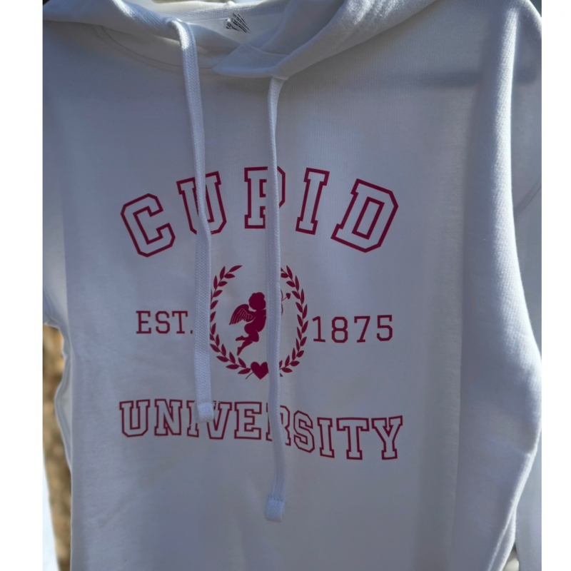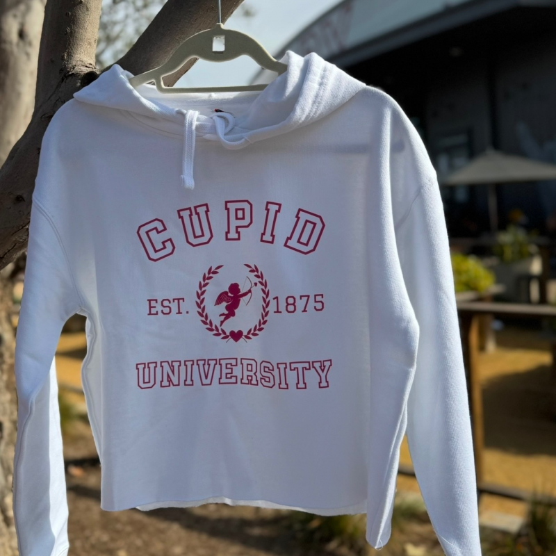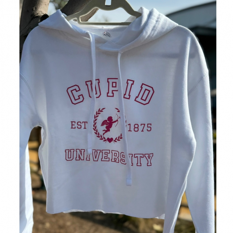 Women’s Valentine’s Day crop top hoodie in a cute design. Choi University pink graphics on a white crop top hoodie.
