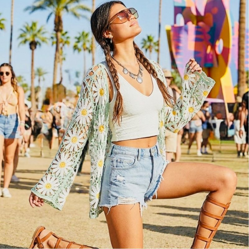 Lightweight Daisy Crochet Cardigan! This cute cardigan in light mint shade is a great addition to your spring wardrobe. I love this piece because it is soft and lightweight, it brings a pop of color to a basic outfit, perfect for festivals, concerts and outdoor shenanigans.