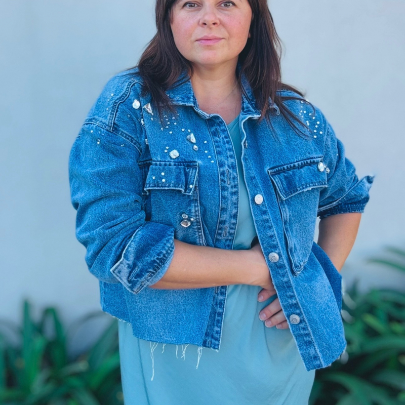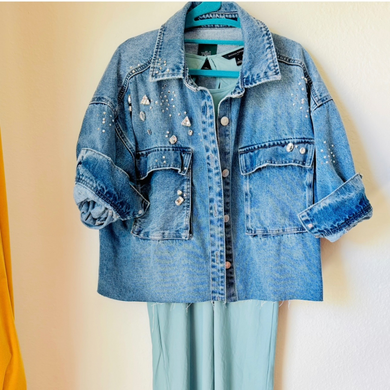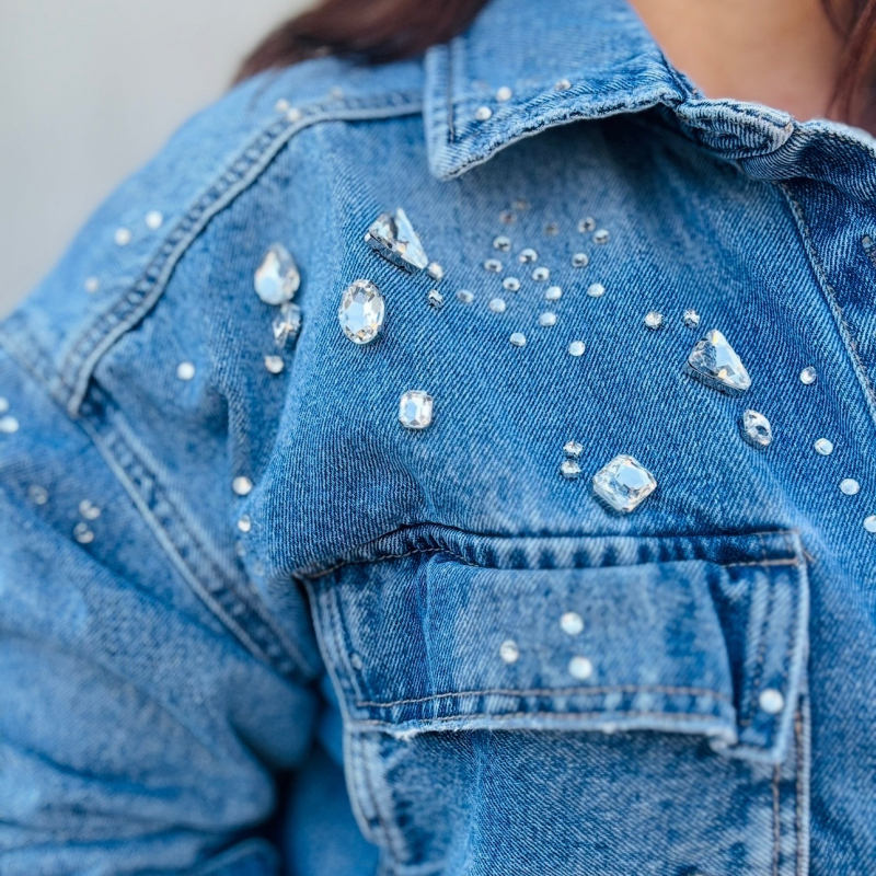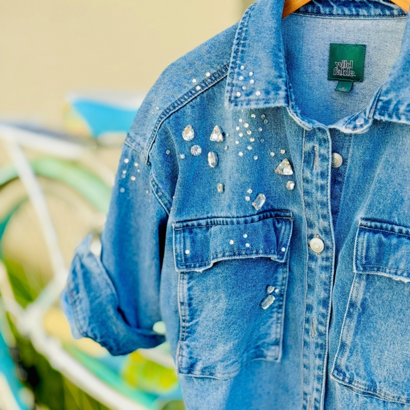 This embellished denim jacket blends sustainable fashion with sparkle, giving you a unique wardrobe essential you won’t find anywhere else.