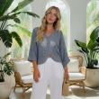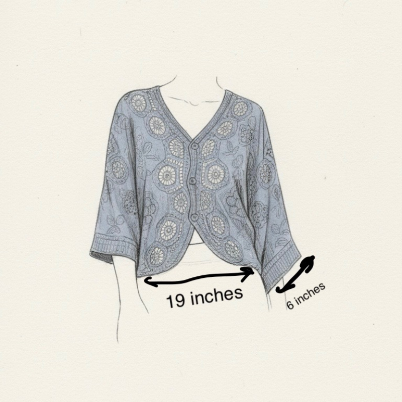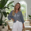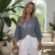 This One Size Embroidered Cotton blouse is the perfect summer addition. Light grey color too that país great with any outfit. Embroidered cotton, bohemian vibe and flattering silhouette with bat sleeve. 3 button closure in the front. The embroidery on this top makes it very feminine. Can be worn as a cardigan.