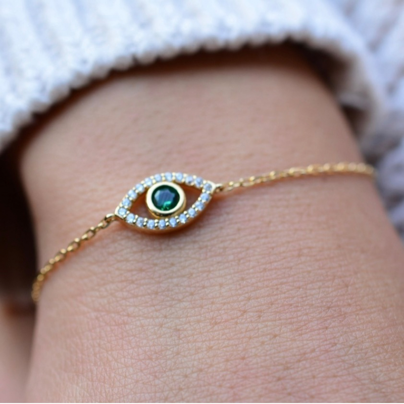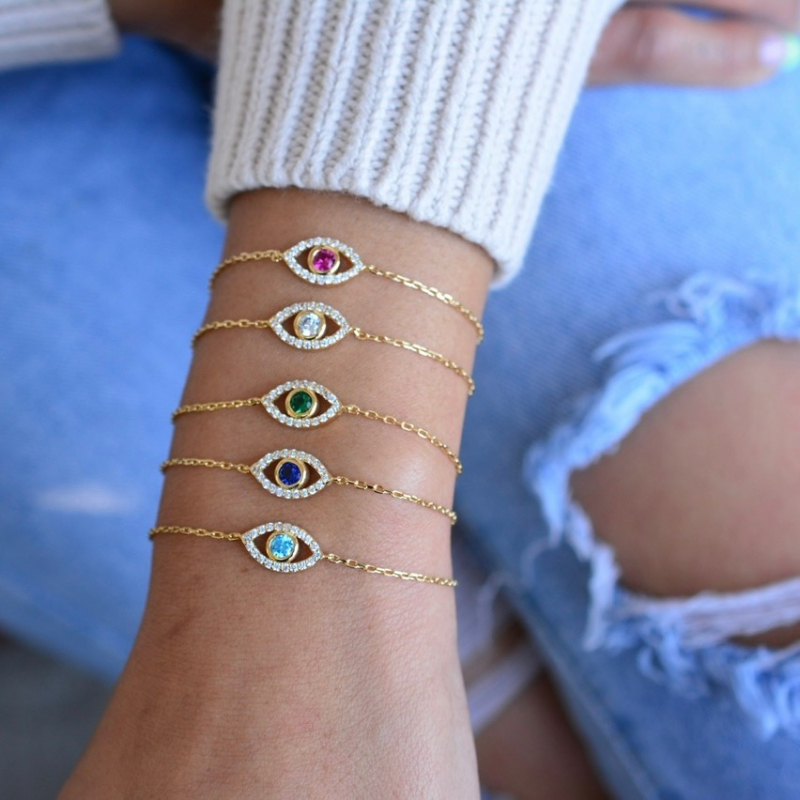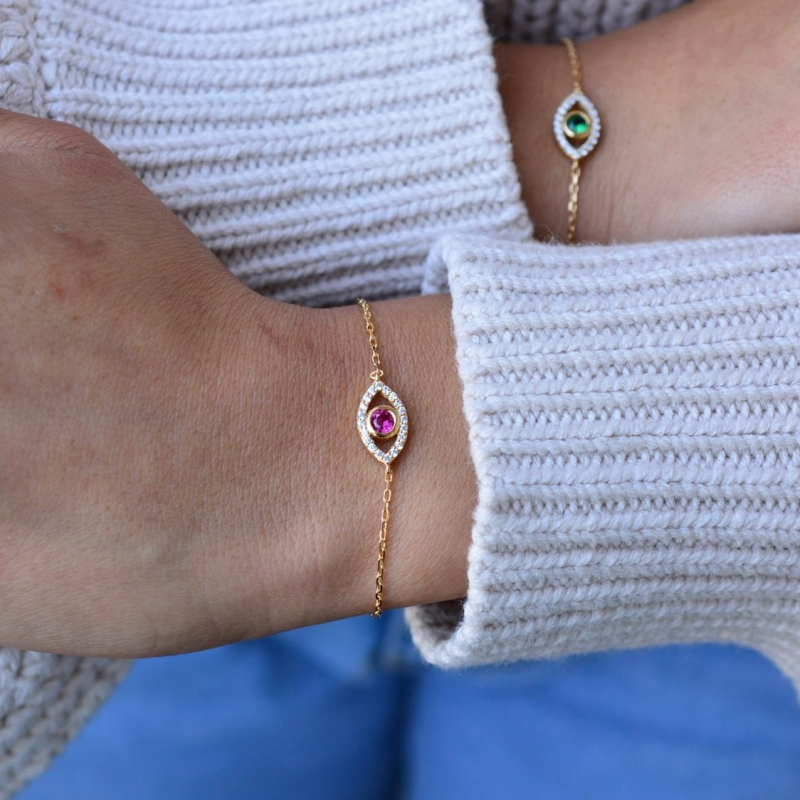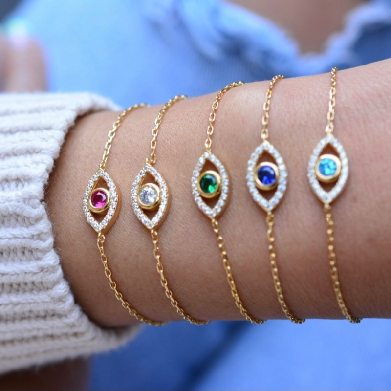 Gold evil eye bracelet with cubic zirconia. Sterling silver .925 evil eye bracelet with gold plating. Clear cubic zirconia and multicolored stone. Made in Turkey.