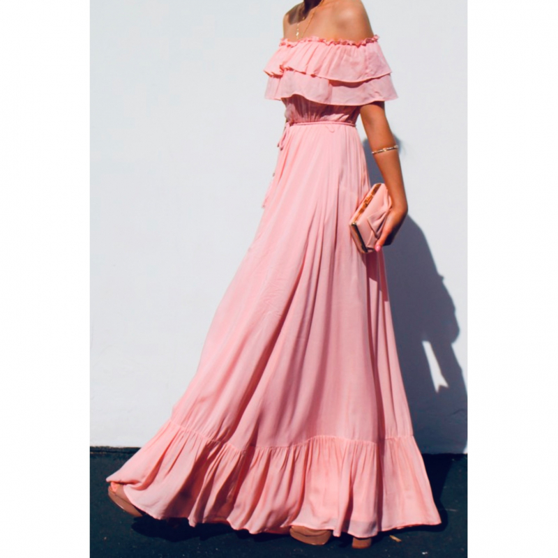 Off the shoulder boho, ruffled maxi dress. Flirty and feminine. Dusty pink blush color, very light fabric. Skirt part is lined, the top isn’t. Perfect for summer nights. Elastic around the shoulders and at the waist, tassel belt.