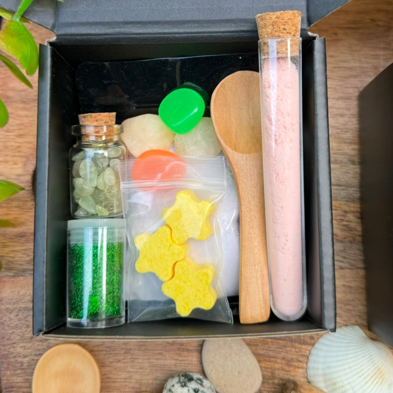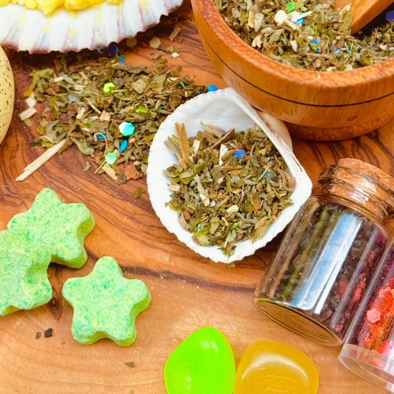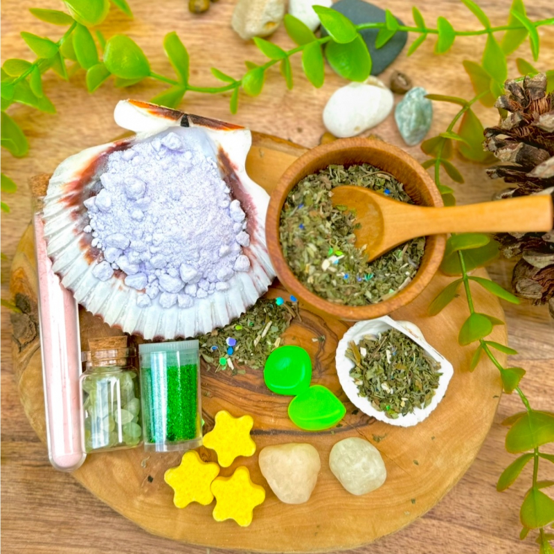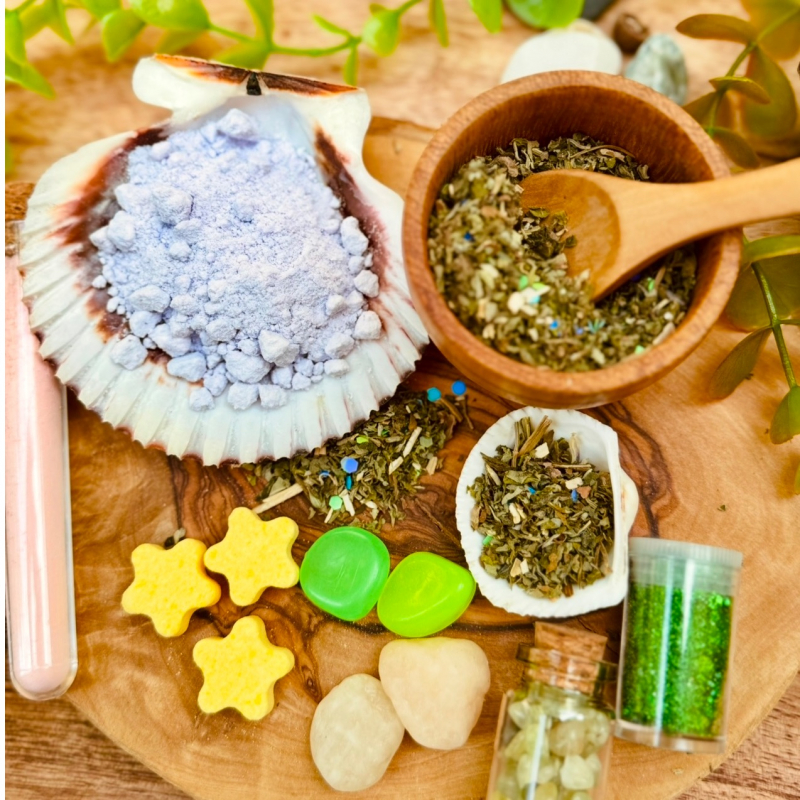 Secret Garden Potion Kit mini for kids opens the doors to imaginative play. Curious little hands will love opening a magical box and mixing herbs and flowers with glitter and fizz. This is a mini kit, perfect for goodie bags for a special magical birthday party or as activity for a backayard or park birthday party. Just add water to make magic.