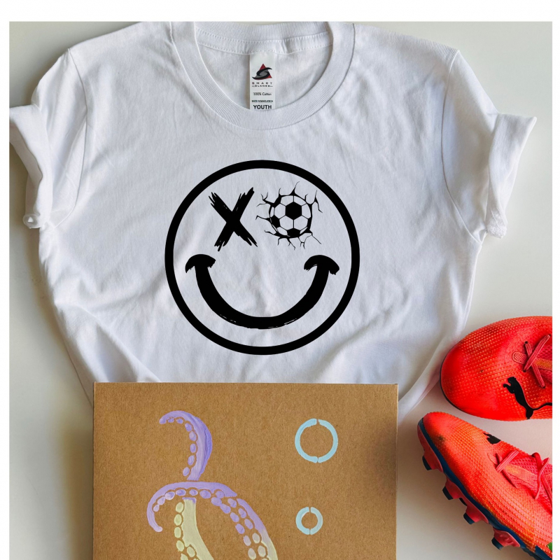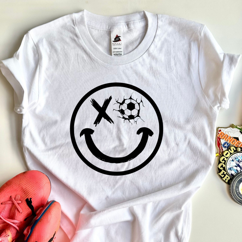 Featuring a fun and classic smiley face with a soccer ball, this stylish and comfortable soccer t-shirt is a must-have for little athletes. The high-quality DTF (Direct-to-Film) print ensures a vibrant and durable design that holds up game after game.