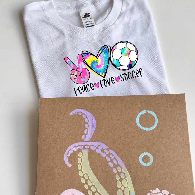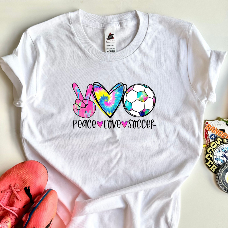 This vibrant DTF (Direct-to-Film) printed t-shirt features a hand-drawn peace sign, a heart, and a soccer ball, representing the love and passion for the game! The bright, eye-catching design makes it the perfect soccer gift for girls who live and breathe the sport.