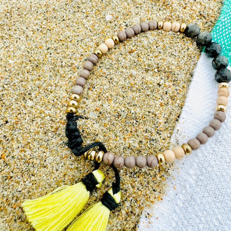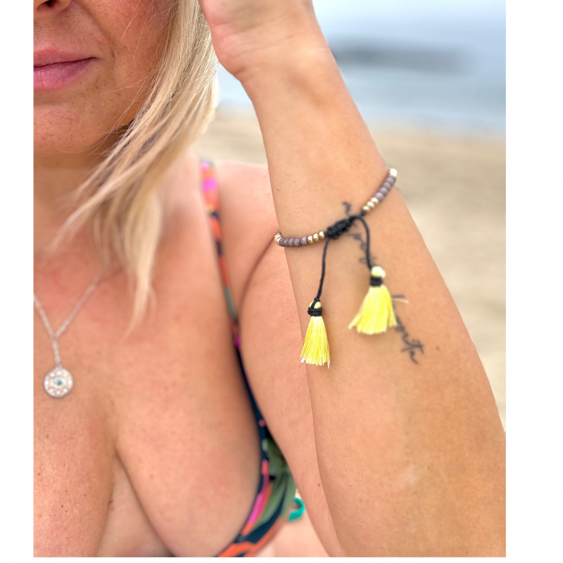 Tassel bracelet, perfect to add to a beach outfit. Fun and flirty bright neon yellow tassels. Cute boho style.
