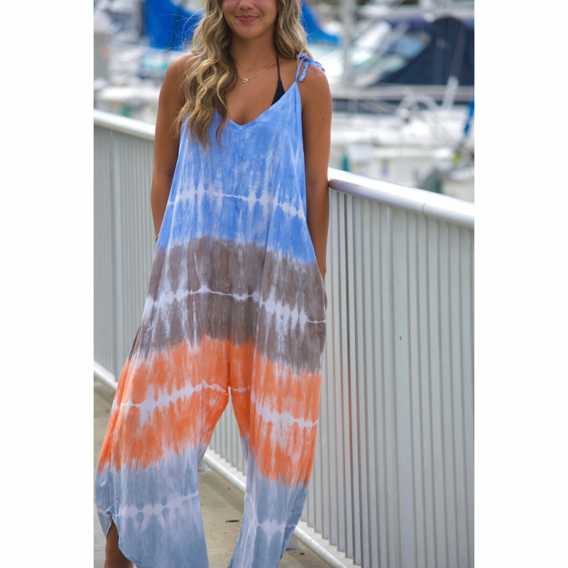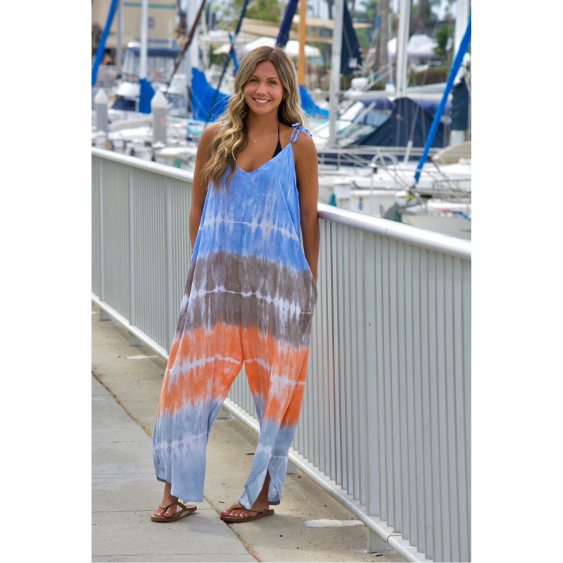 Lightweight tie dye jumpsuit in bright orange/blue colors. Boho jumpsuit, very comfy and perfect for lounging and strolling a local Sunday market. Adjustable shoulder ties, side pockets.