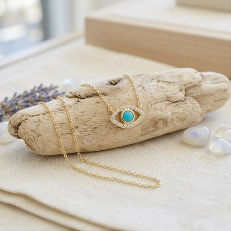 Evil eye necklace in .925 sterling silver. This evil eye necklace is gold plated sterling silver, has clear cubic zirconia and turquoise color cubic zirconia. These are made in Turkey and ship from California.