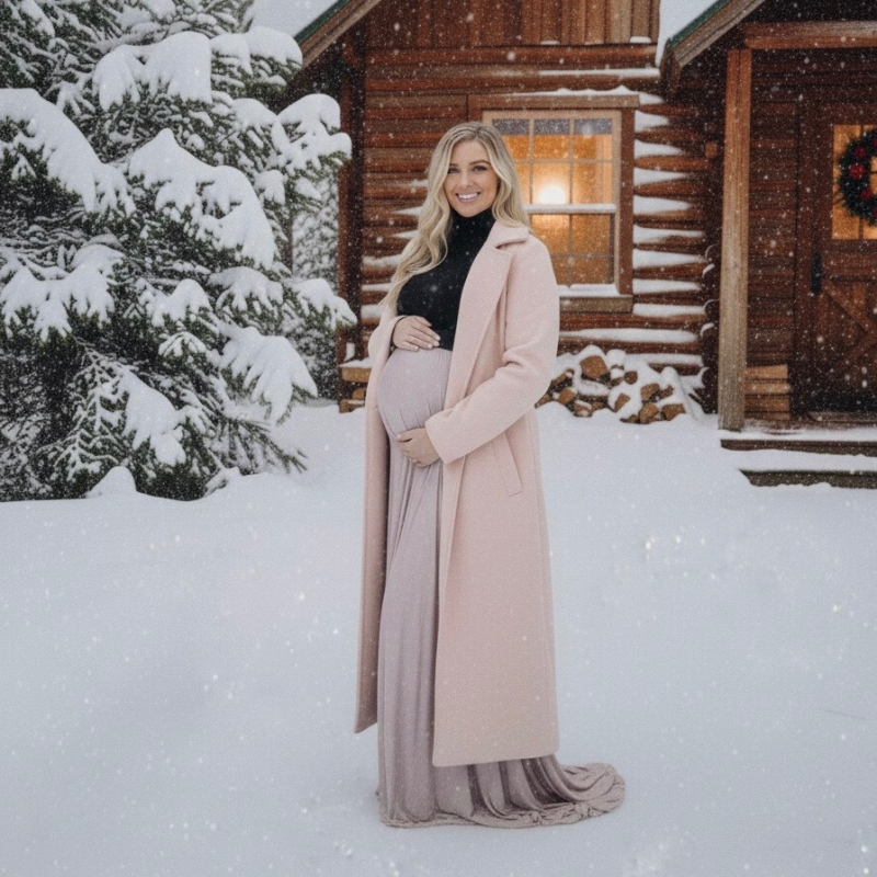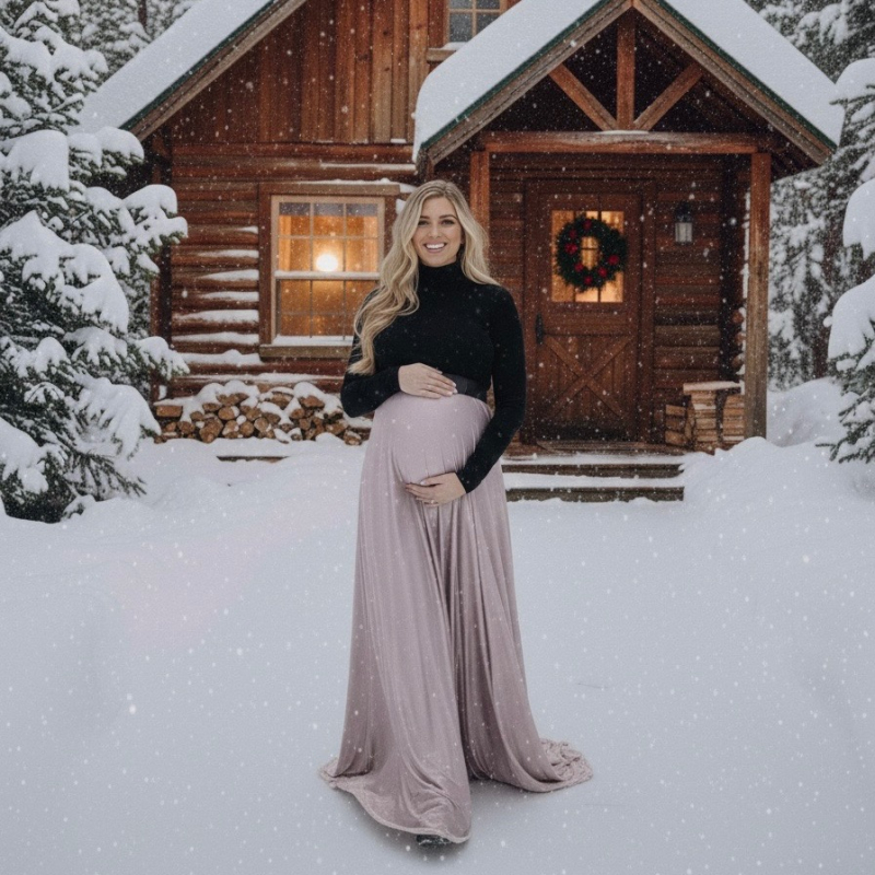 Versatile and easy to style, this maternity maxi skirt pairs beautifully with a simple fitted top, cozy sweater, or classic jean shirt. Add a belt for extra definition and a polished look. Its rich velvet texture gives it a luxurious, timeless feel, perfect for capturing unforgettable pregnancy memories.